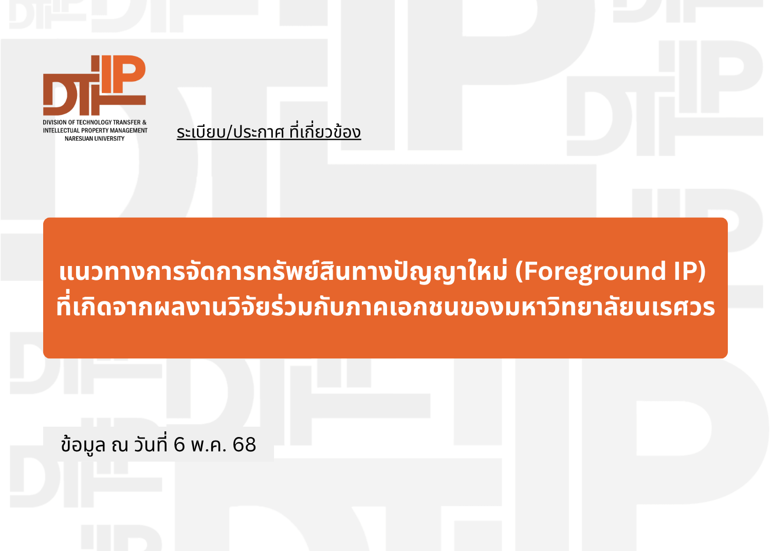 แนวทางการจัดการทรัพย์สินทางปัญญาใหม่ (Foreground IP) ที่เกิดจากผลงานวิจัยร่วมกับภาคเอกชนของมหาวิทยาลัยนเรศวร foreground-ip แนวทางการจัดการทรัพย์สินทางปัญญาใหม่ (Foreground IP) ที่เกิดจากผลงานวิจัยร่วมกับภาคเอกชนของมหาวิทยาลัยนเรศวร